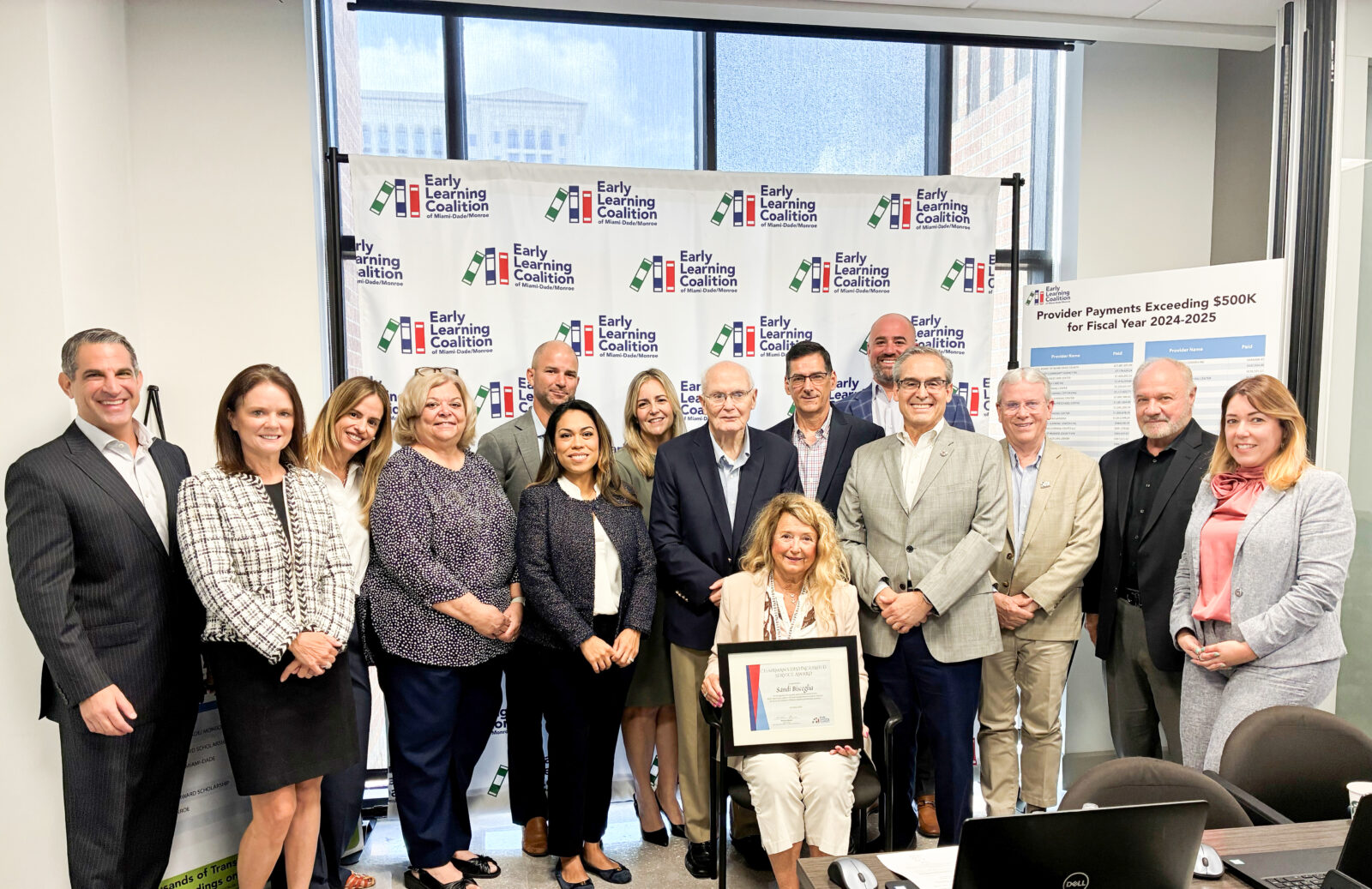 Surrounded by members of the Early Studying Coalition of Miami-Dade/Monroe, Sandi Bisceglia, middle, holds the chairman’s Distinguished Service Award on Oct. 6. CONTRIBUTED